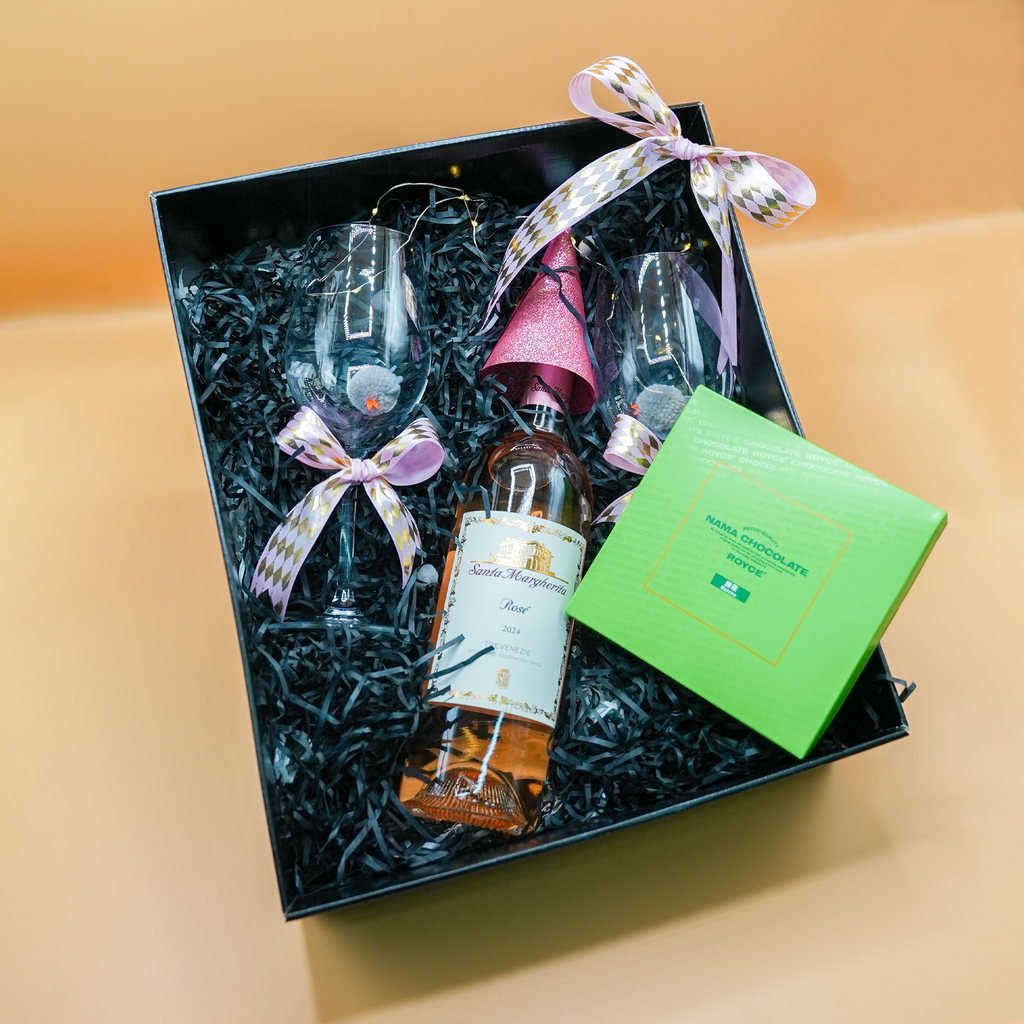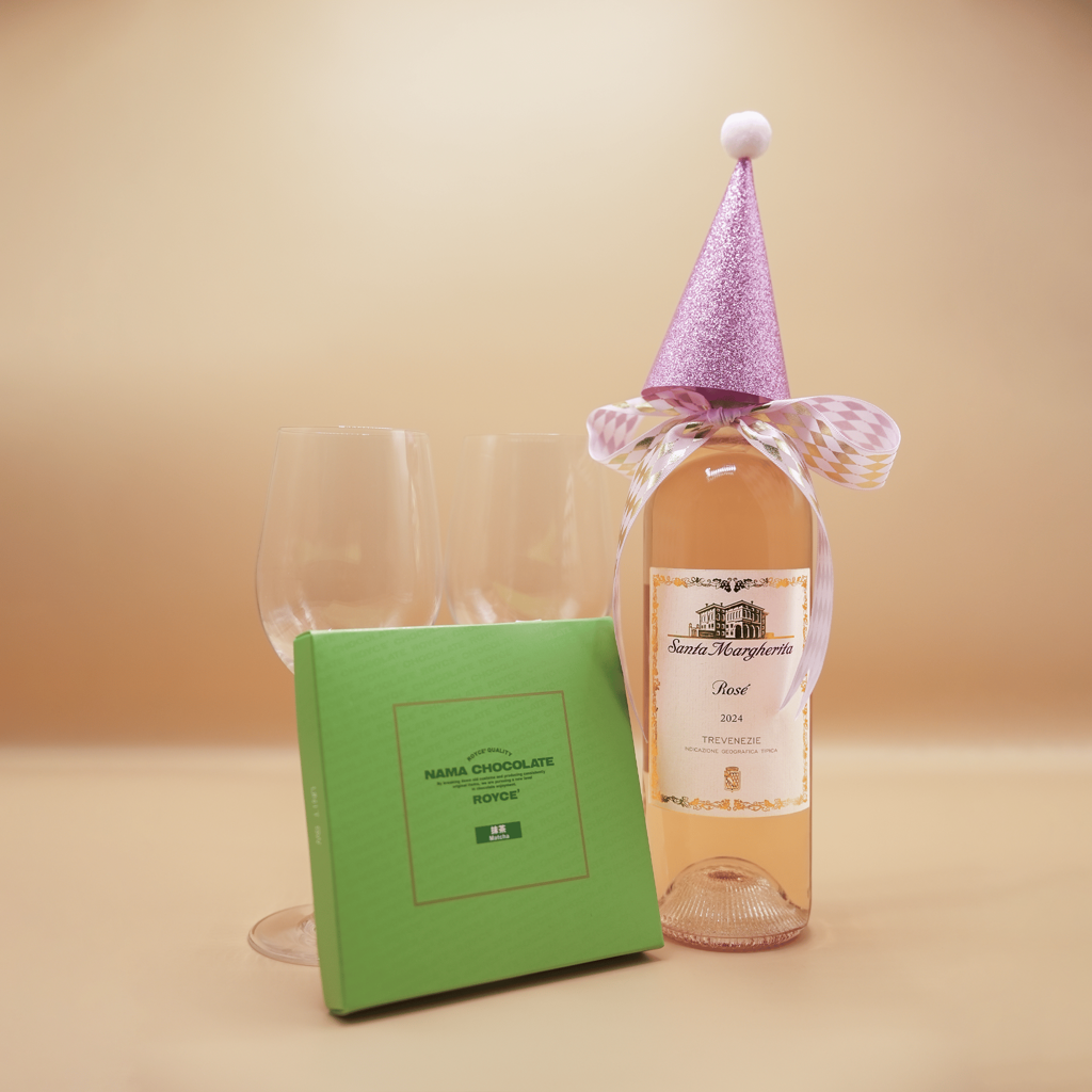 Featuring Santa Margherita Rosé, paired with two elegant wine glasses and smooth Japanese Nama Chocolate.